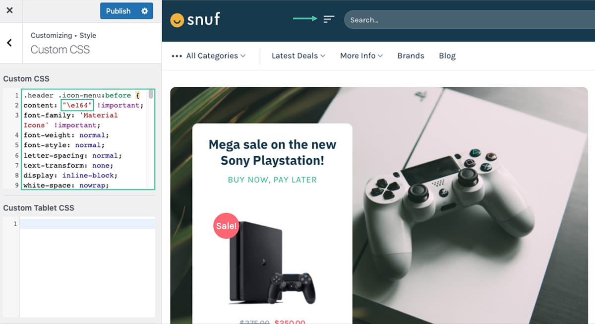 Now it’s time to learn how to replace the Flatsome default icons with the help of CSS code. Below you will find an example how to change the menu icon.